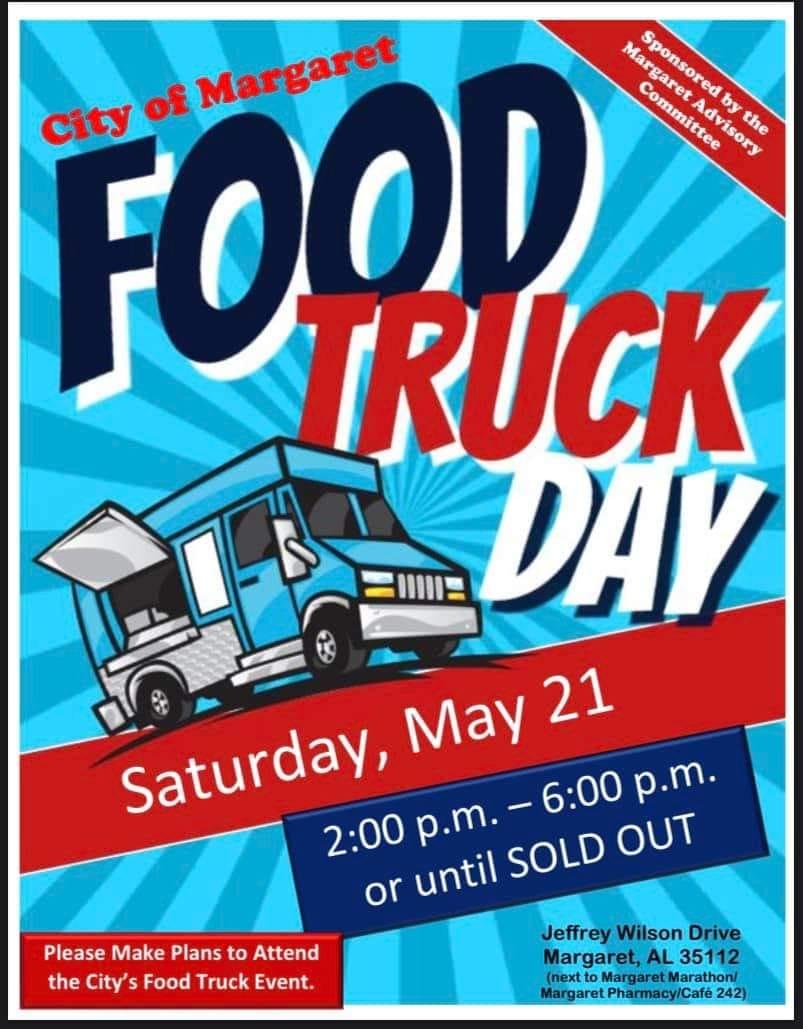 City of Margaret Food Truck Day scheduled for March 21, 2023 from 2:00 pm until 6:00 pm or until sold out. Location: Jeffrey Wilson Drive next to Margaret Marathon. This event is sponsored by the Margaret Advisory Committee.