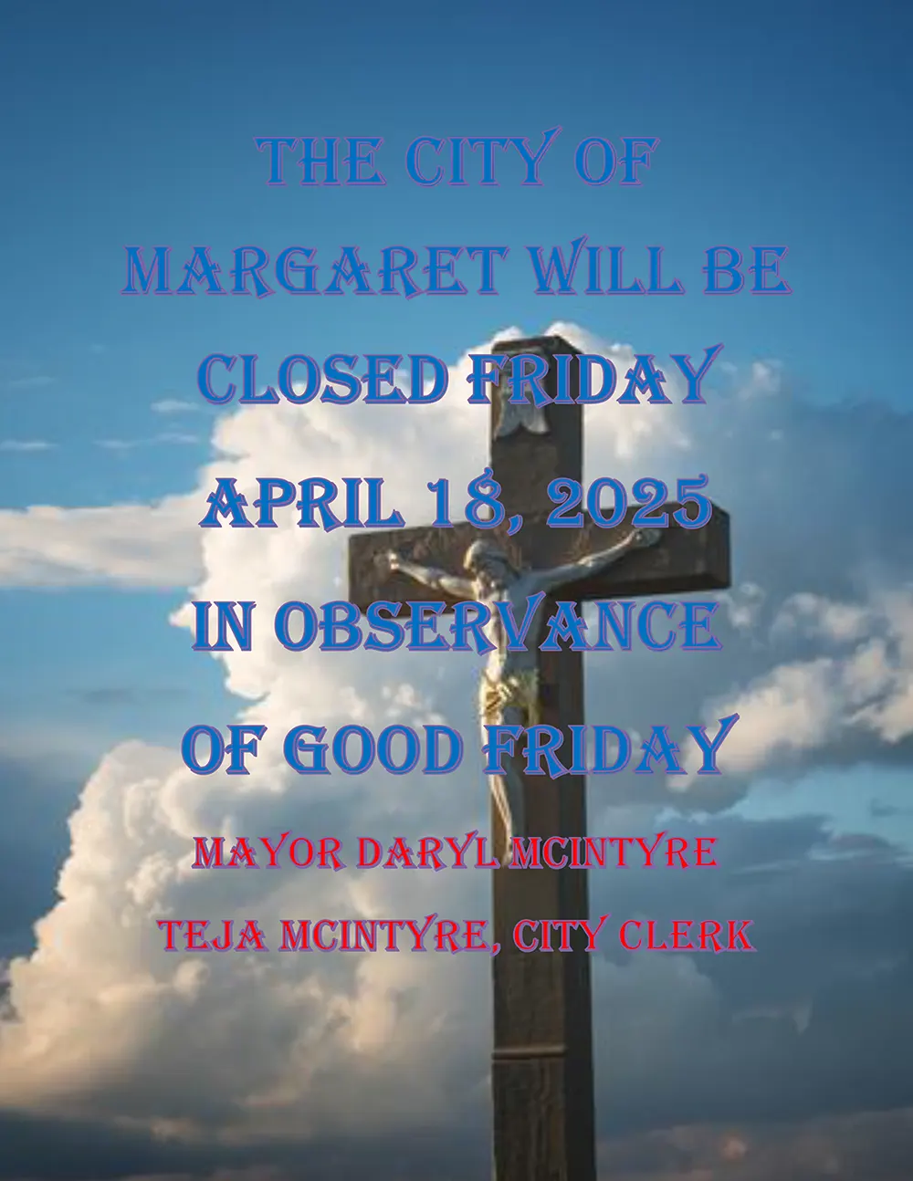 Good Friday 2025 Notice April 15, 2025 The City of Margaret Will be closed Friday, April 18, 2025 in observance Of Good Friday. Mayor Daryl McIntyre Teja Mcintyre, City Clerk Posted in Town News